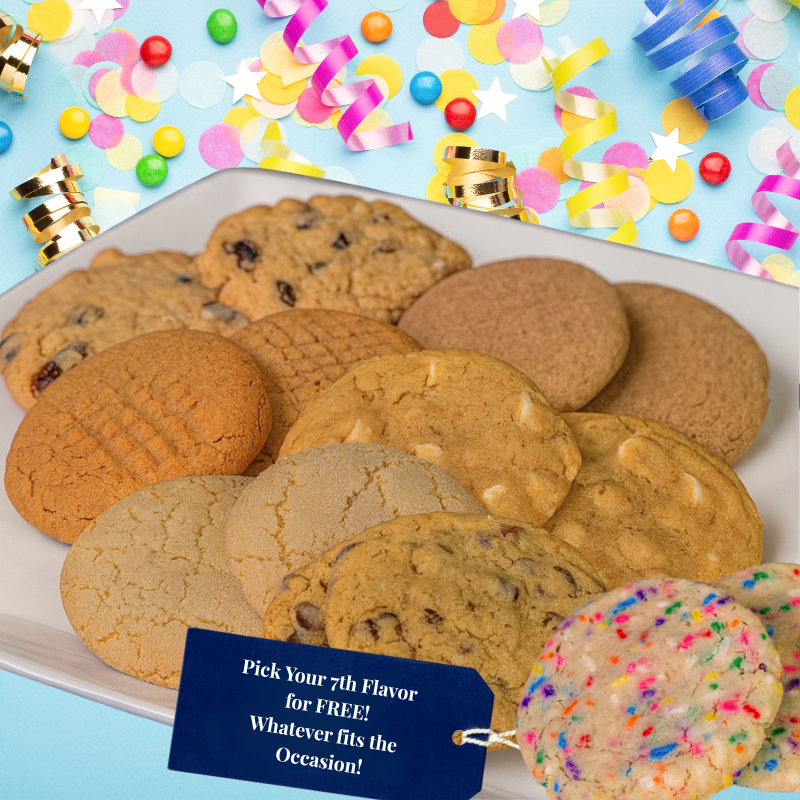 Bundle: Chocolate Chip Semi-Sweet (2), Cinnamon Delight (2), Oatmeal Raisin (2), Peanut Butter (2), Classic Sugar Cookie (2), White Chocolate (2), and you choose the 7th flavor (2) for FREE! The Blue Chip Bundle is 14 Cookies!